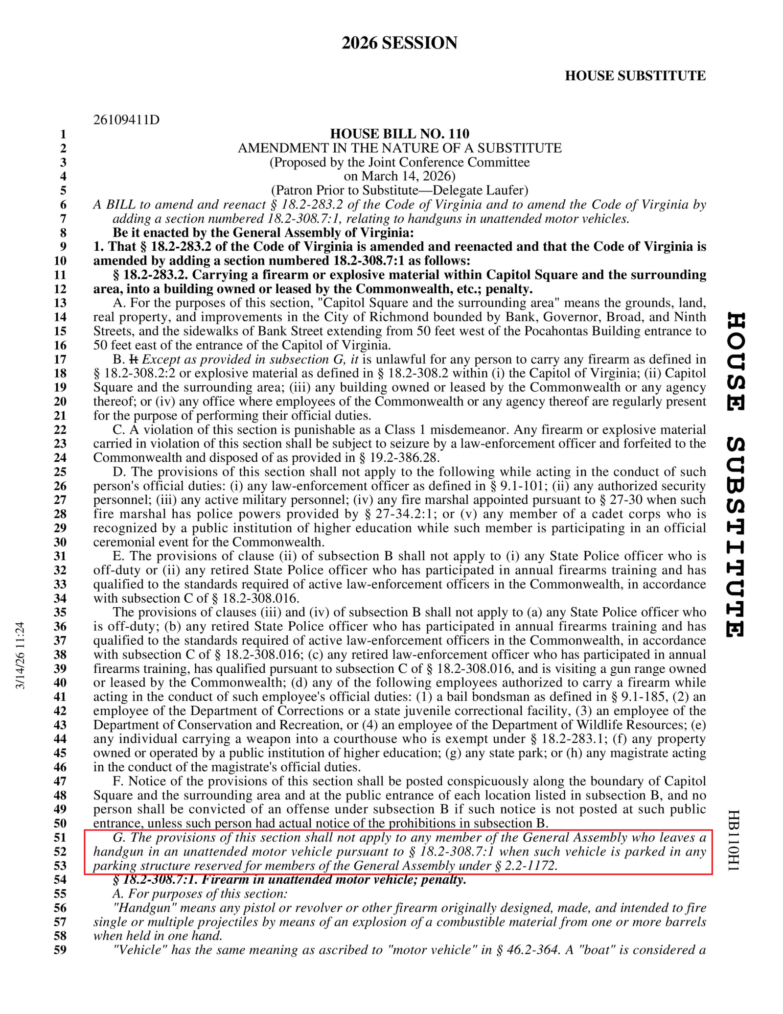 At the same time, the bill creates a new section of law regulating how handguns can be stored in unattended vehicles if that vehicle belongs to someone from the general public.